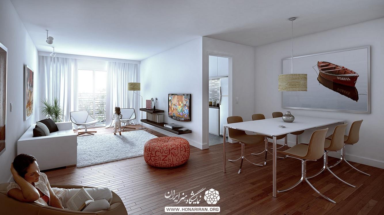 نمایشگاه هنر ایران: این مسئله باعث میشود تا بخش غذاخوری به گونهای مجزا از دیگر بخشها نباشد و حتی تحت تاثیر دکوراسیون فضاهای مجاور خود قرار گیرد. در این حالت است که ارتباط فضایی قطع نمیشود ( به دلیل همخوان و هم نوع بودن دکوراسیون بخشها ) و دکوراسیون بخشهای مختلف خانه به زیبایی در کنار یکدیگر قرار میگیرند .