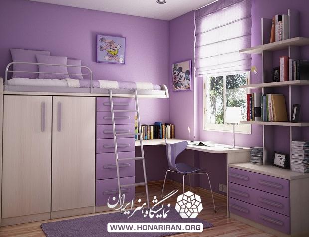 نمایشگاه هنر ایران: در این فضا با ترکیب دو رنگ سرد و گرم یعنی کرم و بنفش در دکوراسیون داخلی اتاق خواب فضایی صمیمی و دلنشین را به وجود آورده ایم.