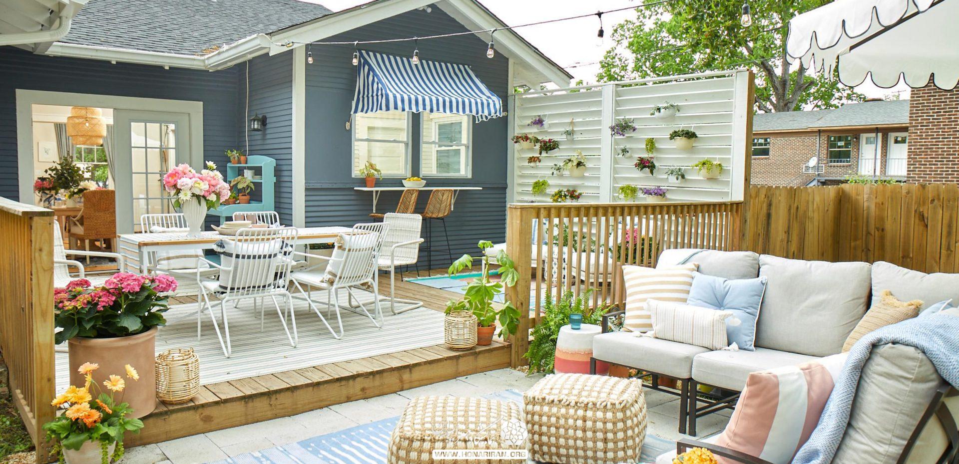 طراح دکوراسیون میگوید با استفاده از بالش و قالیچههای رنگی از میهمانان تان در فضای بیرونی خانه تان پذیرایی کنید. همچنین میتوانید صندلیهای فضای بیرونی خانه تان را با پارچههای رنگی که به پشت آنها آویزان میکنید، تزئین کنید .