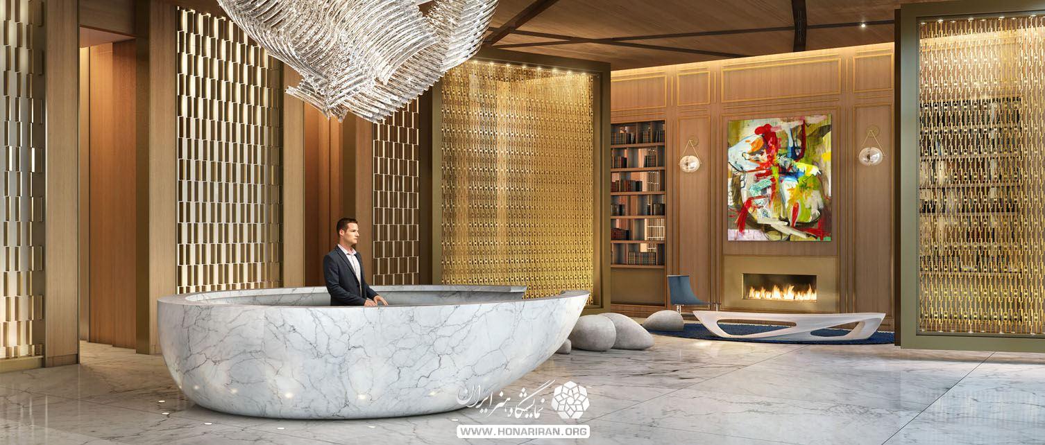 نمایشگاه هنر ایران: لابی هم مثل هر فضای دیگر، با وجود یک نورپردازی خوب، صرفنظر از موضوع روشنایی، جلوه زیبا و متفاوتی پیدا میکند، برای نورپردازی این محیطها با توجه به کاربردهای مختلفی که دارند، به دو نوع نورپردازی نیاز است، یکی نورپردازی وظیفهای فضای نشیمن و پیشخوان و دیگری نورپردازی دکوراسیونی.