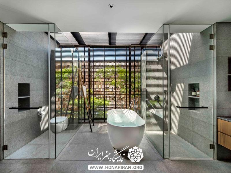 برای مثال در دکوراسیون حمام و سرویس بهداشتی که دارای یک وان با فرم هندسی و مدرن میباشد قسمت زیر دوشی با یک دیوار شیشهای ساده تفکیک شده و در عین حال با یکدیگر مرتبط میباشند.
