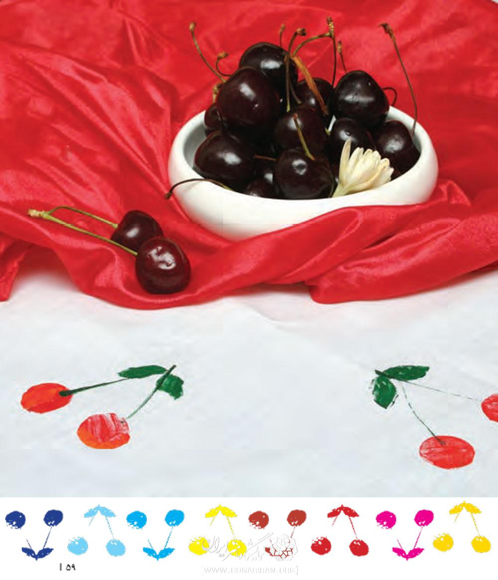 8- مهر ساخته شده ی خود را به رنگ آغشتـه کنید. ســپـس مطابق تصویــر درفاصله های تعیین شده، نقـش گیـلاس را چاپ بزنید.