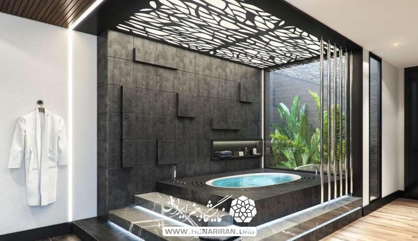 همانطور که ملاحظه می‌کنید از وان حمام به شکل گرد استفاده شده و با سنگ سیاه دودی مسیر پلکانی برای ورود در وان ایجاد شده، از دیگر ویژگی‌های محیط می‌توان به دیوارهای خاکستری رنگ اشاره نمود.
