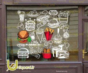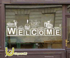 طرح لایه باز استیکر و برچسب دیوار و شیشه رستوران با طرح اسنک و ساندویچ و مرغ سوخاری و حروف welcome