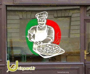 طرح لایه باز استیکر و برچسب شیشه رستوران با طرح سرآشپز پیتزا تنوری