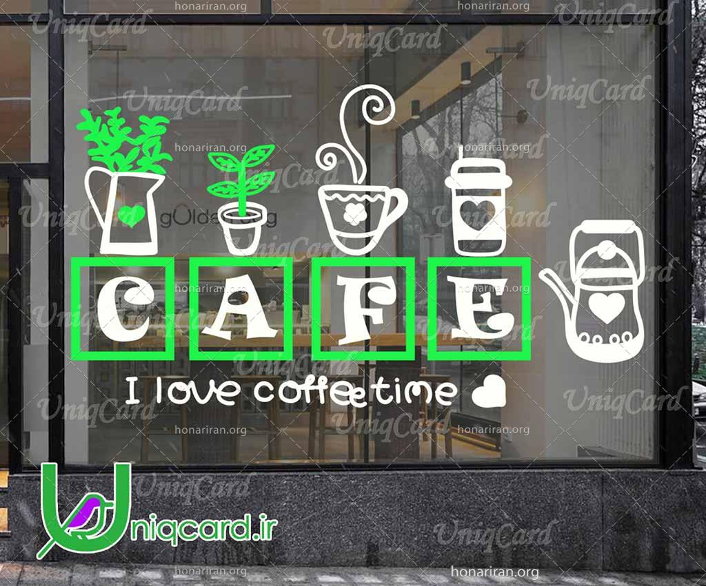 طرح لایه باز cdr کورل دراو استیکر و برچسب دیوار و شیشه کافی شاپ با طرح فنجون قهوه و گلدون و آیس کافی روی coffee