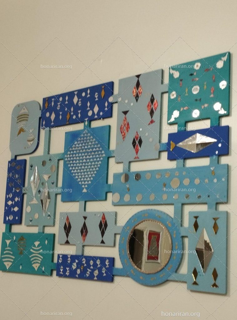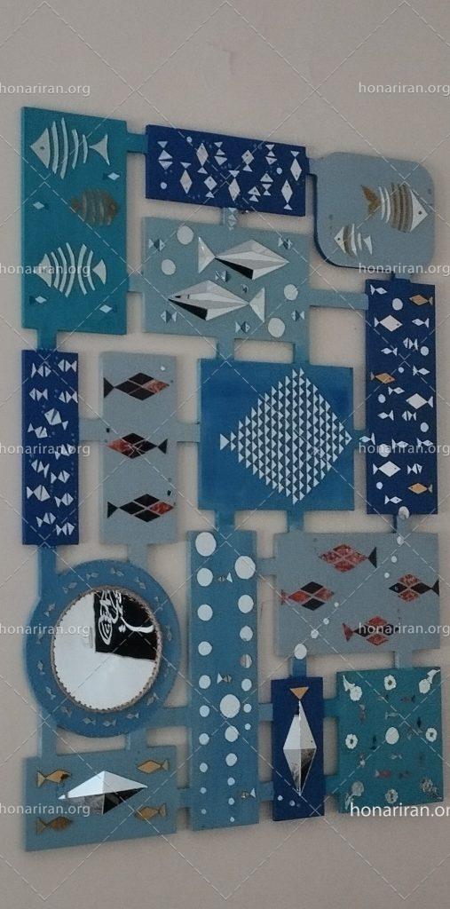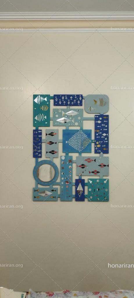 تابلو آینه کاری، دنیای ماهی ها تابلو آینه کاری و شیشه رنگی روی MDF شبکه ای ، زمینه رنگ آکرلیک.
