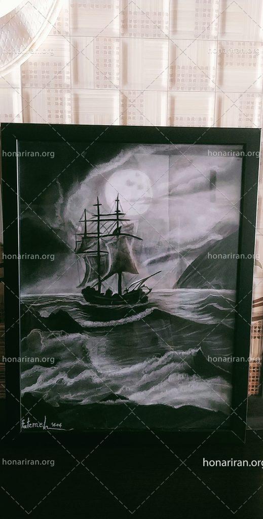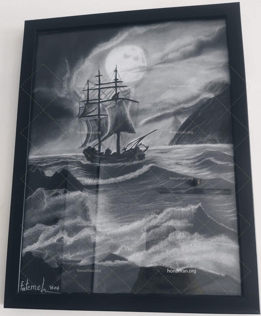 تابلو نقاشی سیاه قلم ماه و کشتی و دریا