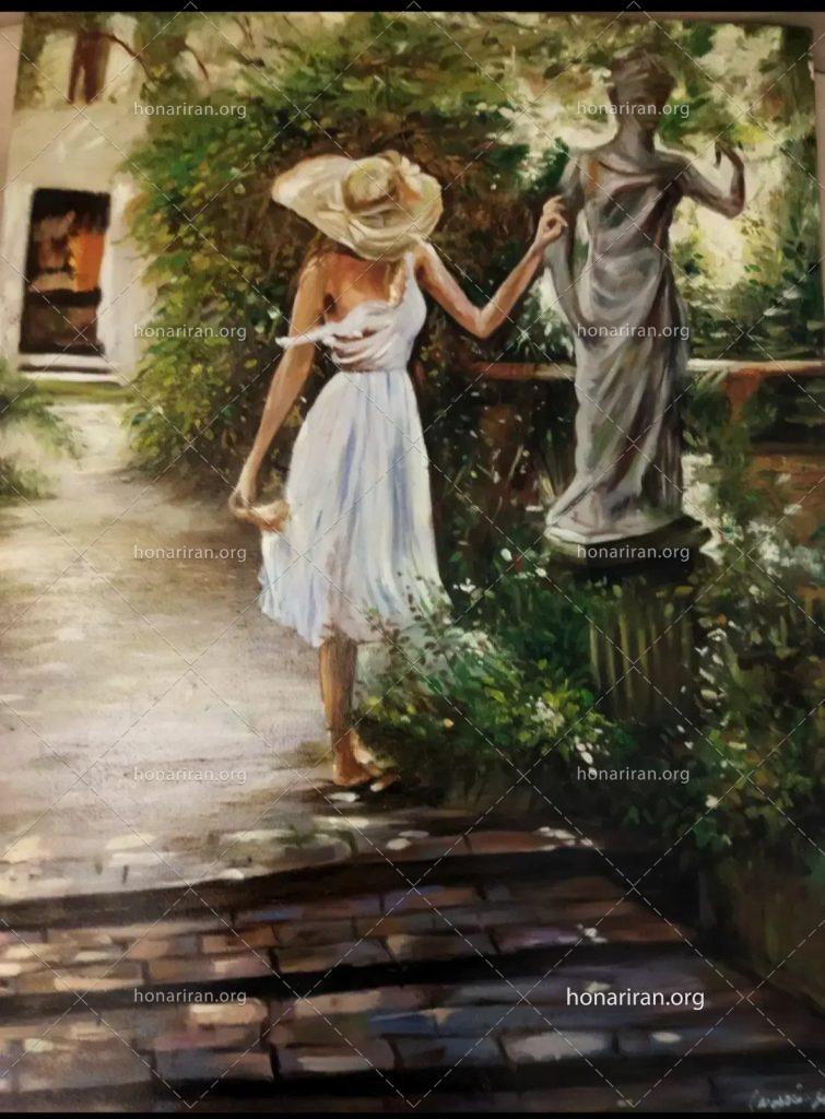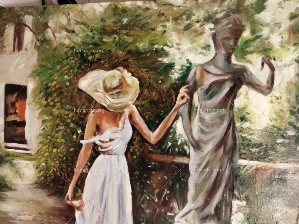 رنگ روغن دختر آفتاب تکنیک رنگ روغن سبک رمانتیسم دختری کنار مجسمه منتظر باران