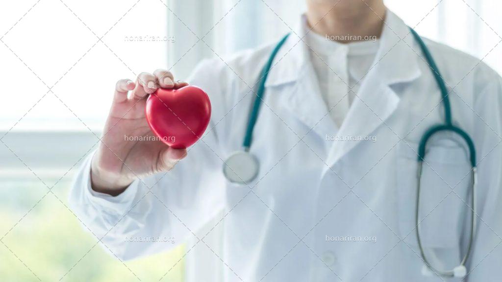 دانلود عکس با کیفیت استتوسکوپ بر روی گردن پزشک و قلب قرمز در دست
