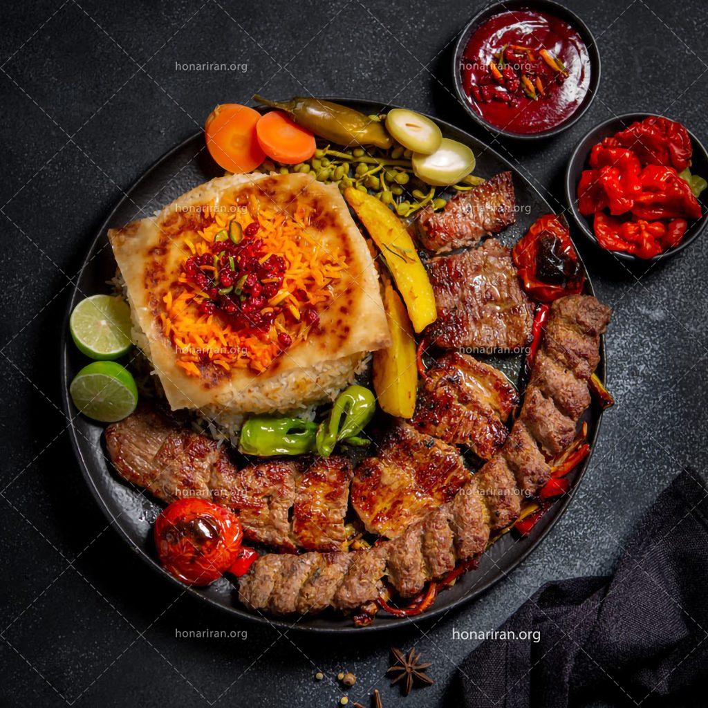 دانلود عکس با کیفیت کباب برگ در کنار کباب کوبیده در سینی به همراه گوجه و خیارشور و ته دیگ و برنج