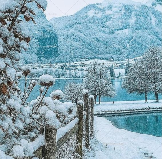این تصویر منظرهای زمستانی را نشان میدهد که در آن گیاهانی با گلهای خشکشده و پوشیده از برف در پیشزمینه قرار دارند. برف روی شاخهها و یک حصار چوبی کوچک نشسته است. در پسزمینه، دریاچهای آرام با آب شفاف و کوههایی پوشیده از برف دیده میشود. آسمان روشن و بدون ابر است و چند درخت بدون برگ در کنار دریاچه خودنمایی میکنند. کل صحنه حس آرامش و زیبایی طبیعت در فصل زمستان را منتقل میکند.