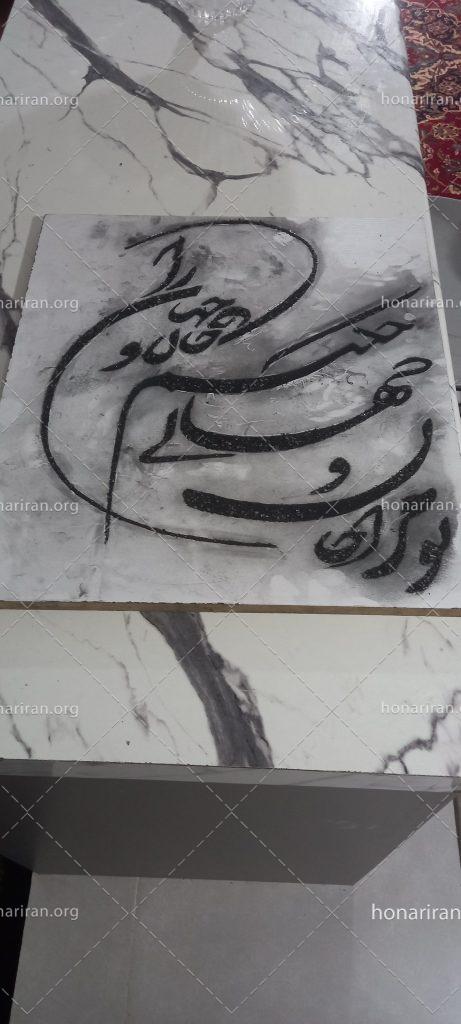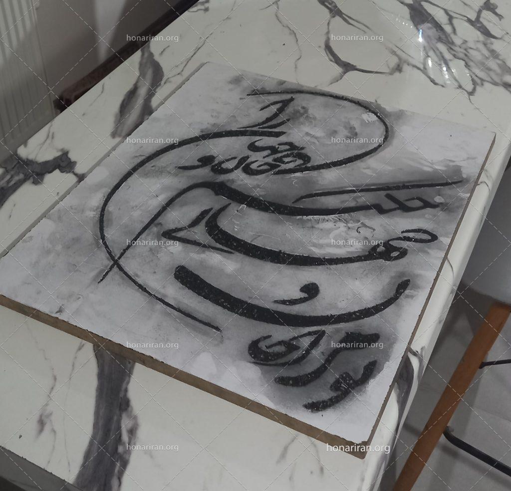 قطعه عکس شکسته در آتش و باد شکسته نستعلیق روی هر سطحی ب جز کاغز با زغال رنده شده و ماسه و شیشه خورد شده