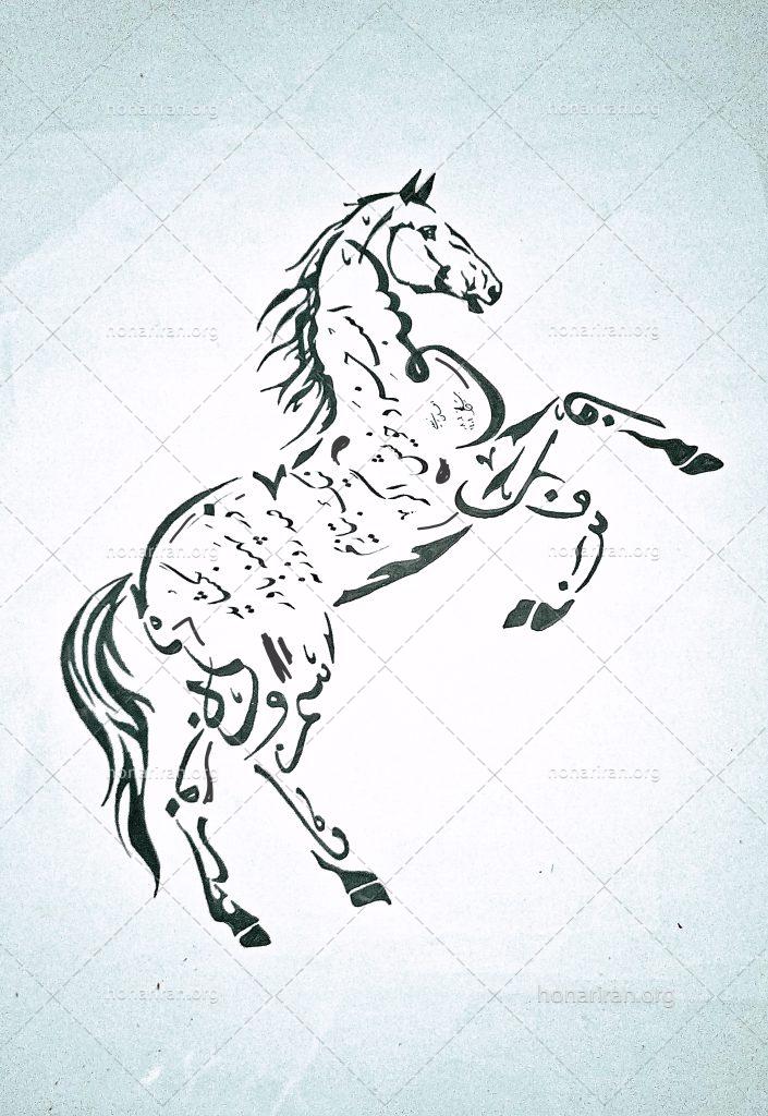 نقاشی خط با شعر «اسب خرد خویش اگر نیک بتازیم صد روزنه در پهنه باور بگشاید» تصویر اسب با خطوط فرمی ، همراه با خط نستعلیق با محتوا شعر . اسب خرد خویش اگر نیک بتازیم صد روزنه در پهنه باور بگشاید