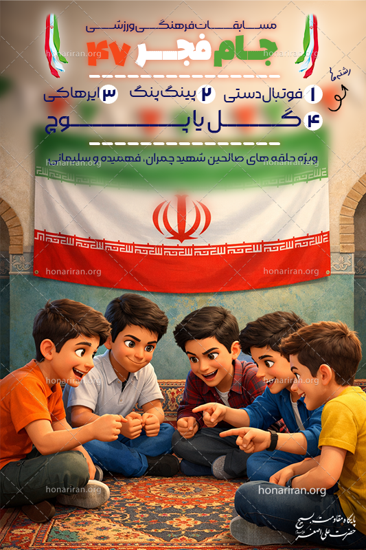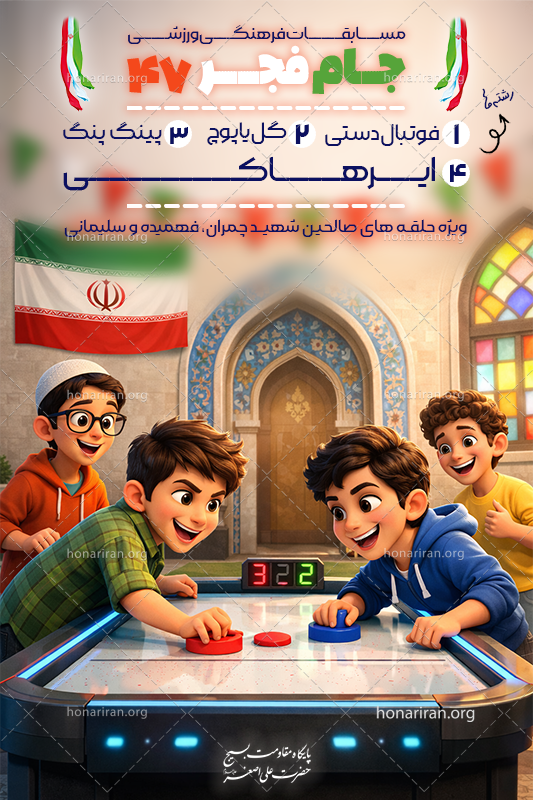 پوستر مسابقات ورزشی جام فجر پوستر مسابقات ورزشی جام فجر در رشته های پینگ پنگ (تنیس روی میز)، ایرهاکی، گل یا پوچ، فوتبال دستی چهار پوستر جداگانه برای چهار رشته ورزشی