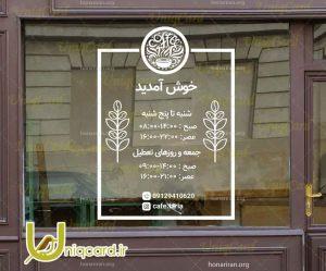 طرح لایه بازاستیکر و برچسب شیشه کافی شاپ با طرح خوش آمدگویی گویی و ساعات کاری کافه
