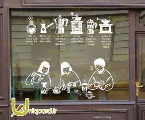 طرح لایه باز استیکر و برچسب شیشه کافی شاپ با طرح مشتری های کافه درحال خوردن قهوه