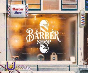 طرح لایه باز استیکر و برچسب شیشه آرایشگاه مردونه با طرح چهره مرد و نوشته barbershop