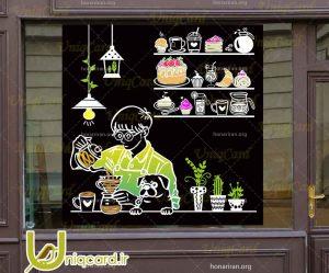 طرح لایه باز استیکر و برچسب شیشه کافی شاپ با طرح پسر درحال ریختن قهوه و خوردن کیک
