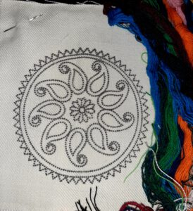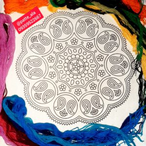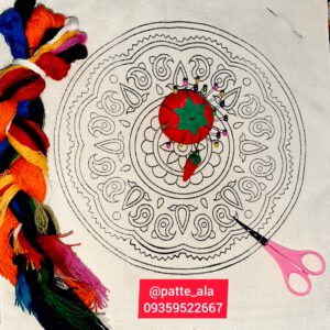 شروع دوختن: انتخاب کنید اولین رنگ نخ را و با سوزن دوزی، با دقت و تمرکز طبق طرح روی پارچه دوخت کنید.
